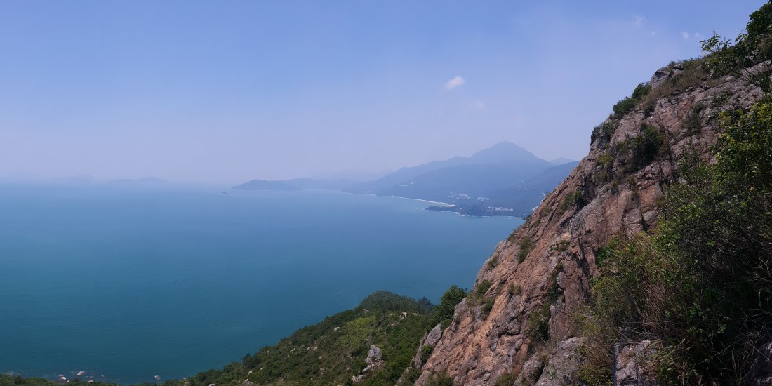 抵達羅屋村巴士站後在前方斑馬線橫過馬路,轉右進入芝麻灣道開始走鳳凰徑第十二段(L122 標距柱),遇上往貝澳泳灘的分岔路時沿左邊拾塱的路牌走。約十分鐘路程後便會來到貝澳岸邊的開揚位置,後方的大東山及二東山亦清晰可見。當經過天后廟準備左轉時(地圖位置1),右方有一條往望東灣的小徑,在此可選擇 1. 沿鳳凰徑走到芝麻灣郊遊徑起點,再順走郊遊徑至南崖入口(路程較長),或者 2. 轉入望東灣的小徑,再走到一絲帶位置爆林接回芝麻灣郊遊徑(地圖位置2)路線較短但需爆林)。在經過郊遊徑 C1404標距柱後往前走一小段,來到一木橋位置,旁邊便是登老人南崖的位置。時值初夏,植物已經開始茂密,驟眼看去會是一次艱辛的上升。
