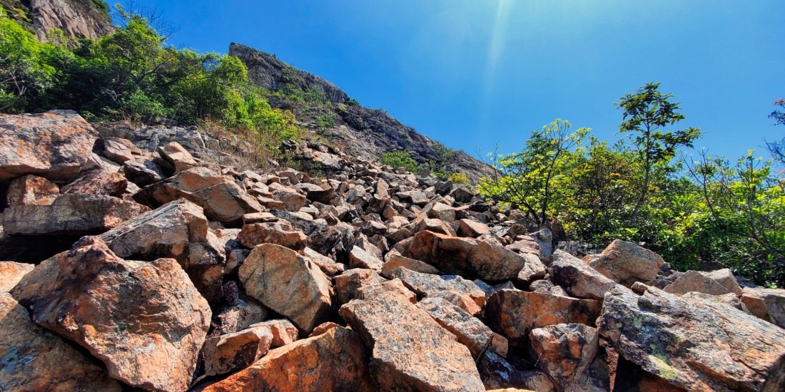 繼續往上方走,來到石河的盡頭接上面積較大的岩石堆。這裡要作一小段的上攀,難度比前一段的爆林易,但仍需小心覓上升的位置避免偏離至險要位置。四周雖開揚但斜度不大,岩石群也相對穩固,腳步夠穩便沒有問題。攀過幾塊較大的石後向右移便能看到路胚,再沿路胚走一小段便能接回芝麻灣郊遊徑。
