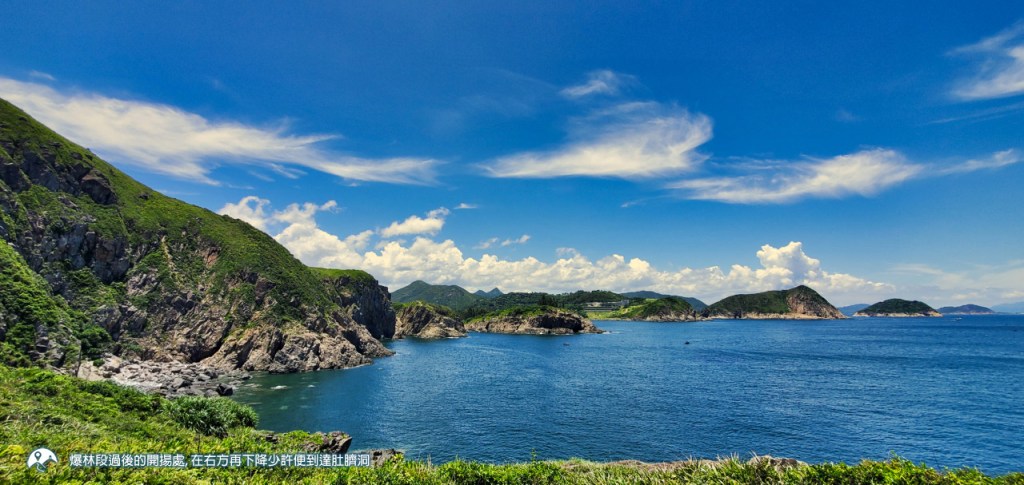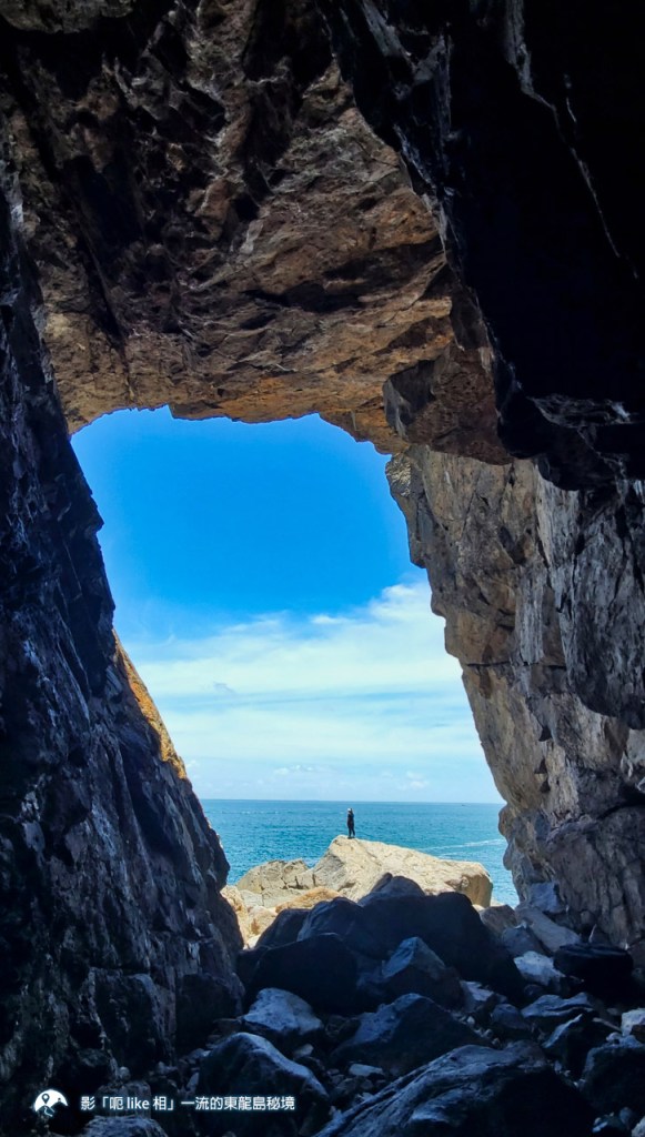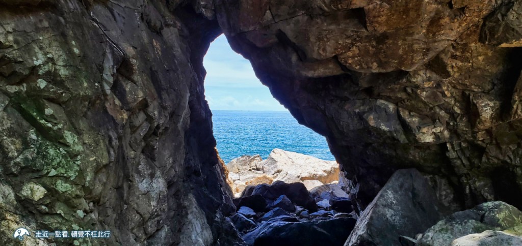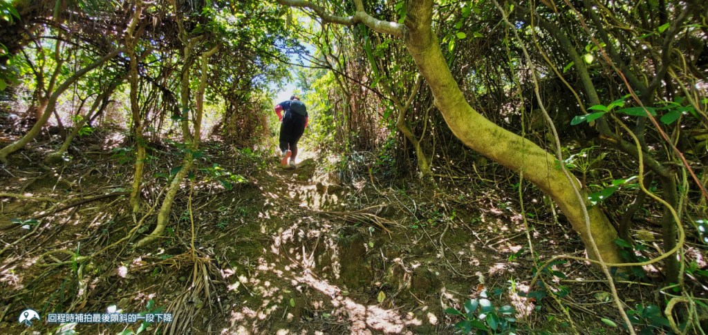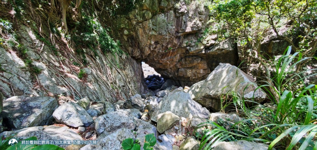 當上升至一平坦處準備再次急登前,留意左邊有一條往海的狹窄小徑(可能會被密遮蔽),從這裡一直下降至海平線。這段路路胚尚算明顯,但到訪的人不多,兩旁植披非常茂密,當中有不少檔路絆腳,也有檔在你面前的蜘蛛網需俯身通過。走起來頗為吃力。這個爆林段大概要花上 40 分鐘,走到末段一個略為平坦開揚的位置時往右邊覓路下降,這最後的下降斜度,幸好只是幾步路的距離,可借旁邊樹幹輔助下降。抵達下方的岩石陣後便代表終於來到隱藏於東龍洲海岸的景點肚臍洞。但別太興奮,接近洞前的巨石堆有一定高低差,仍需小心下降。這海蝕洞的體積十分龐大,從上方往下看及走到洞內能看到不同的形狀,站在走到盡頭外的巨石亦能拍到以肚臍洞為「相框」的特照片。相比起之前的暴曬段,這裡風涼水冷,是個能待上好一陣子的地方。玩樂及大休過後原路折返,回靄走剛剛的爆林段時可能會不知不覺「爆錯方向」偏離了路線,不確定時最好開 GPS 確認。順利的話回程會比下降快,接回主山徑後大概也筋疲力竭(如選擇繼續前往南堂頂的話需注意餘下路段沒有任何補給,亦要繞大圈才回到士多),所以繼續原路下降回營地,再回到碼頭旁的士多完成行程。