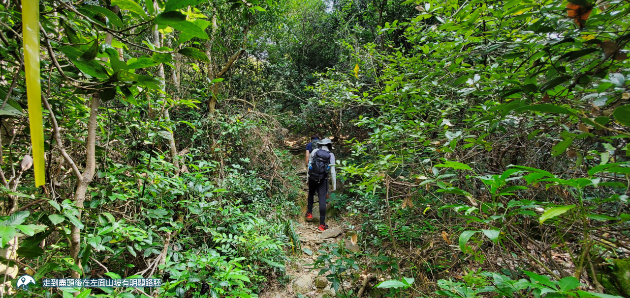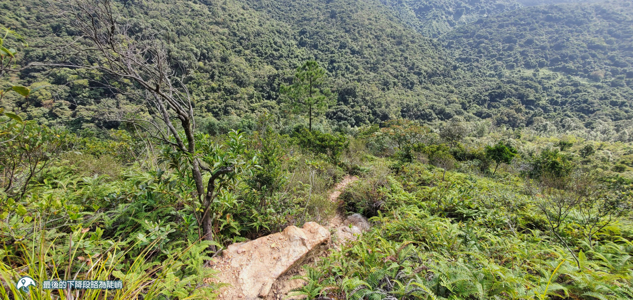 離開標高柱後沿山嶺橫移,風景相對沒登山的一段豐富,也沒有太大變化,但被群山圍繞感覺寫意。山路的尾段路旁有數個廢置建築,注意走錯路踏空。來到山嶺東面開始下降至流水響水塘,路段略斜,部分位置有浮沙碎石,路旁偶有較粗的樹枝可借力。待下至樹林間便差不多接上正常山徑,沿流水響郊遊徑走,嫌行程不夠的話可順道到附近的鶴藪或經布格仔走到皇后山印度廟。走出鶴藪道後餘下均是水泥路,可選擇在八仙嶺郊野公園路口等小巴離開或一直沿大路走出沙頭角公路完成行程。