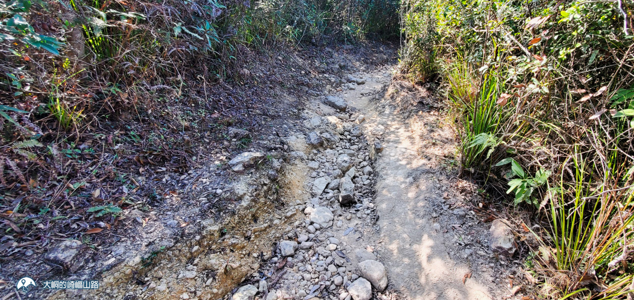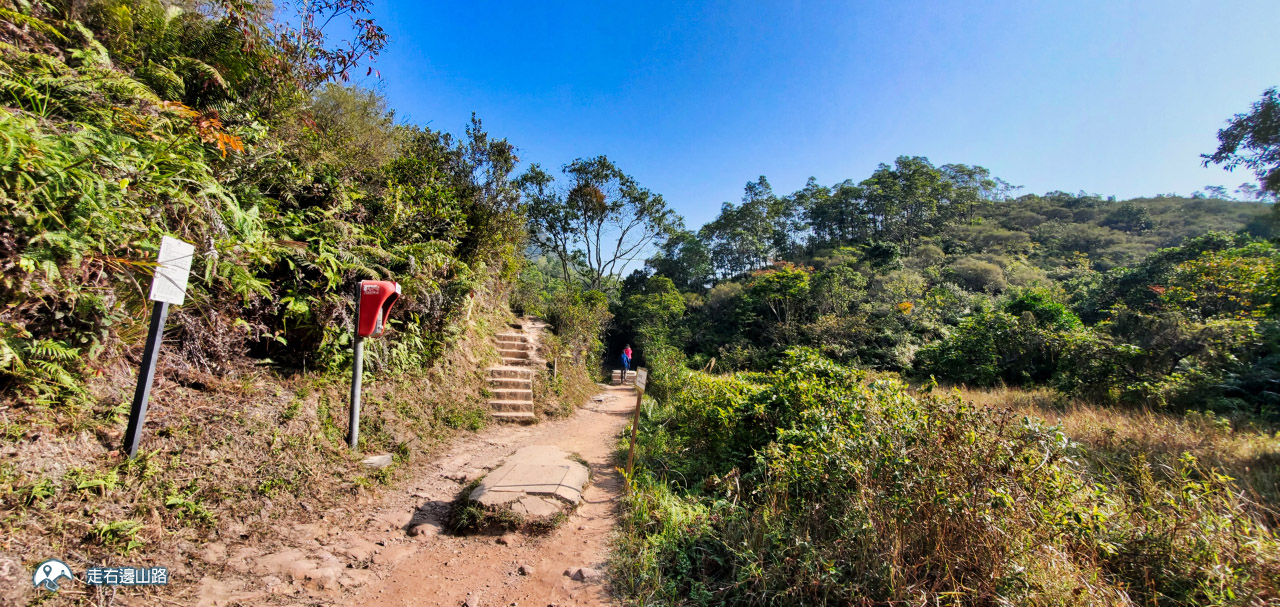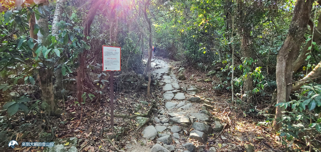 起步位置在郊遊熱點烏蛟騰,下車後沿村路經過烏蛟騰公廁進入往九坦租的小路,走約 1.2 公里後在九坦租的路口選擇右路(往吊燈籠或三椏村通常會走左邊上路),一直沿平緩易行的路走,在下苗田路牌後不久在右邊叢林可看到明顯小徑,進入這條徑(註:續行主路的話在前方不遠處的路牌處亦可抵達相同起點),經過一開揚草叢後便來到登上大峒的山路。這裡開始是近二百米的攀升,路段起初是石板路,隨高度上升路面開始出現零散的石塊及沖蝕的崎嶇深坑路,體力消耗比想像中的多,上升到一定高度後在北面有開揚的風景,可看到整個吊燈籠的山嶺。大峒的上升段長約 1.2 公里,需時約 20 – 30 分鐘。登上大峒,接上船灣淡水湖郊遊徑後迎來一大段平路,可邊走邊回氣。從大峒經觀音峒至紅石門的路口約有 1.7 公里路程,易走但沒有風景,只有一兩個位置能觀賞船灣淡水湖。