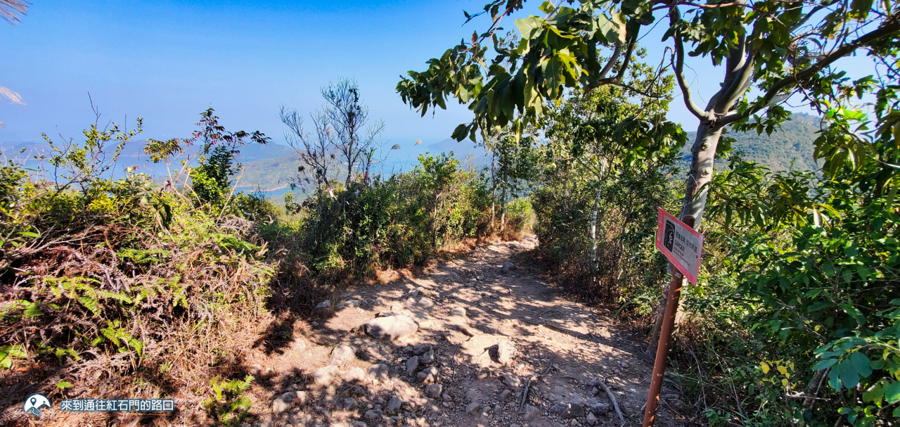 當前進方向轉至東南方後,留意在其中一個下坡段,看到右方有「懸崖危險」的警告牌時,在正對面的左邊草叢繫有引路絲帶(可參考照片),這裡便是下降至紅石門的路口。剛剛切入小徑的一段路較為狹窄及陡峭,但其後的路段都很清晰,順著山勢及唯一的路下降便可,偶而有一些高低不平的路面及浮石需留意。經過約 30 分鐘的下降後來到杳無人煙的紅石門水庫,但這裡距離紅石門海岸尚有一段路。走到水庫另一邊後轉入左邊山徑,其後會再經過兩個路口。依照引路絲帶及地上的記號,在第一個路口轉左,第二個路口轉右後(留意地面有人用石堆擋住往前的路),再走一會便到達已荒廢的紅石門村。村裡的空地能找到石椅及桌,亦有一個「露天廚房」,有說村民在節日會坐船回到此處取舊。續沿小徑走到盡頭便抵達紅石門灣,海岸是一片滲紅的岩石,原因相信是這裡的含鐵量高的砂岩在形成時期經歷了強烈的氧化作用而變成了紅色。一場來到不妨沿海岸走走,欣賞這裡獨特的景色。走過紅石門水壩往對岸的話能看到更大片紅色岩石。盡興過後便原路折返,注意從大峒下降至下苗田的一段由登山變成下山,需更加小心崎嶇的山徑及沿路的浮沙碎石。