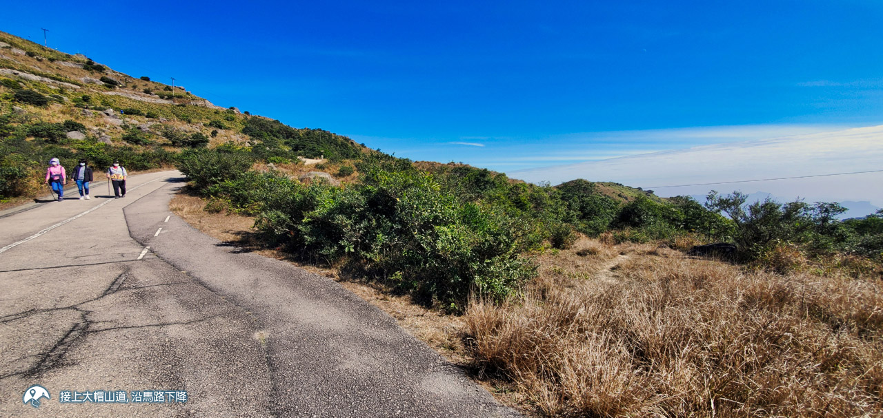 從石堆的北方鑽出來後尋找靠左的路接回主徑,來到這裡已是接近海拔八百米的高度,天氣好的話可邊走邊欣賞大帽山頂的風景。餘下的路均為短草坡,只有小量路段較隱密,不會太難應付。離開草坡後轉左接上橫山徑,路徑變得更易走,很快便能接上大帽山道,再慢慢沿水泥路下降至大帽山郊野公園遊客中心完成行程。