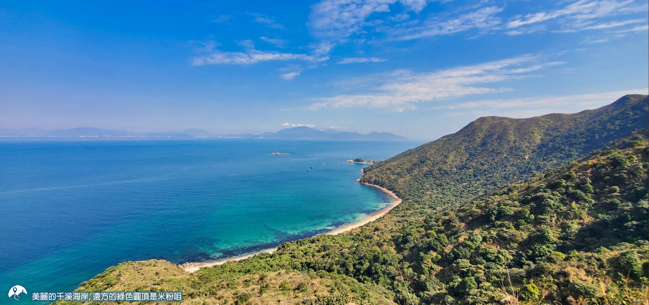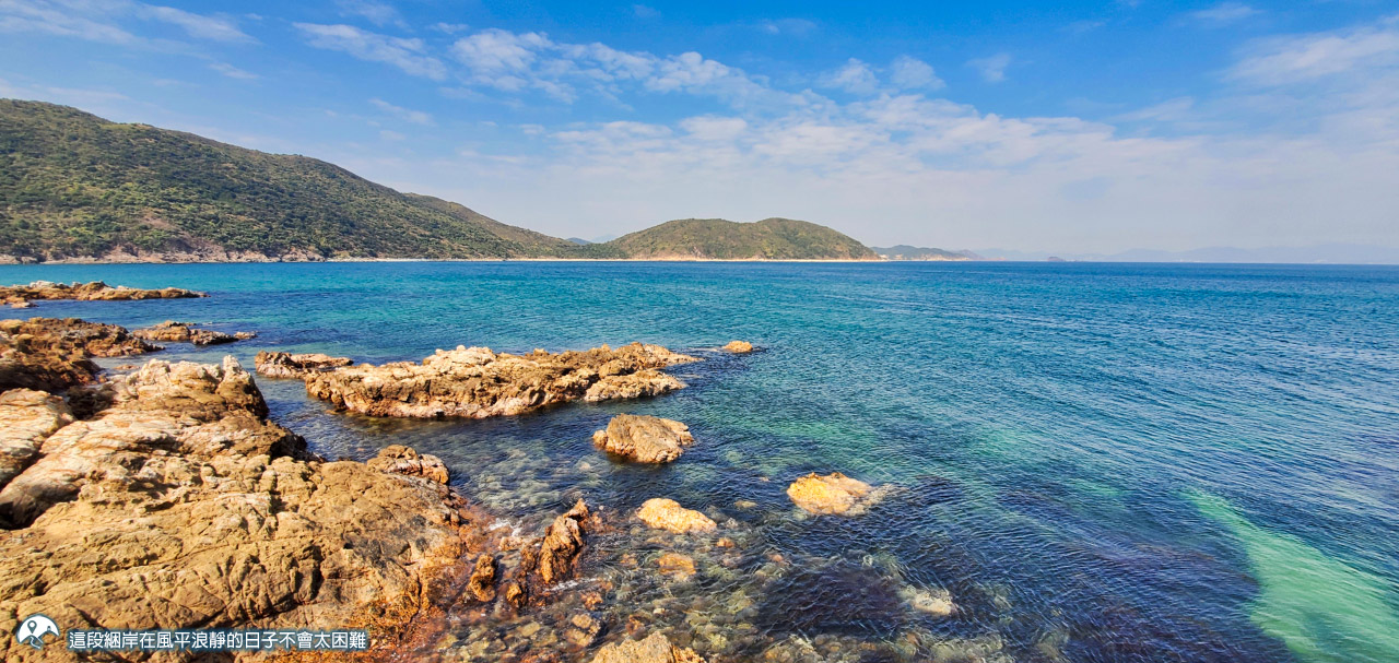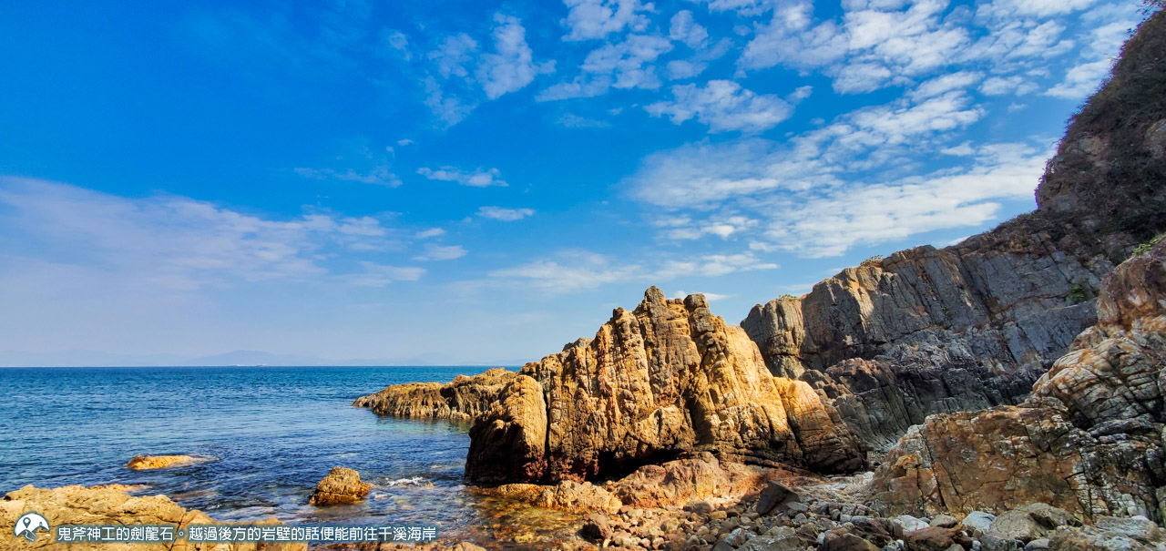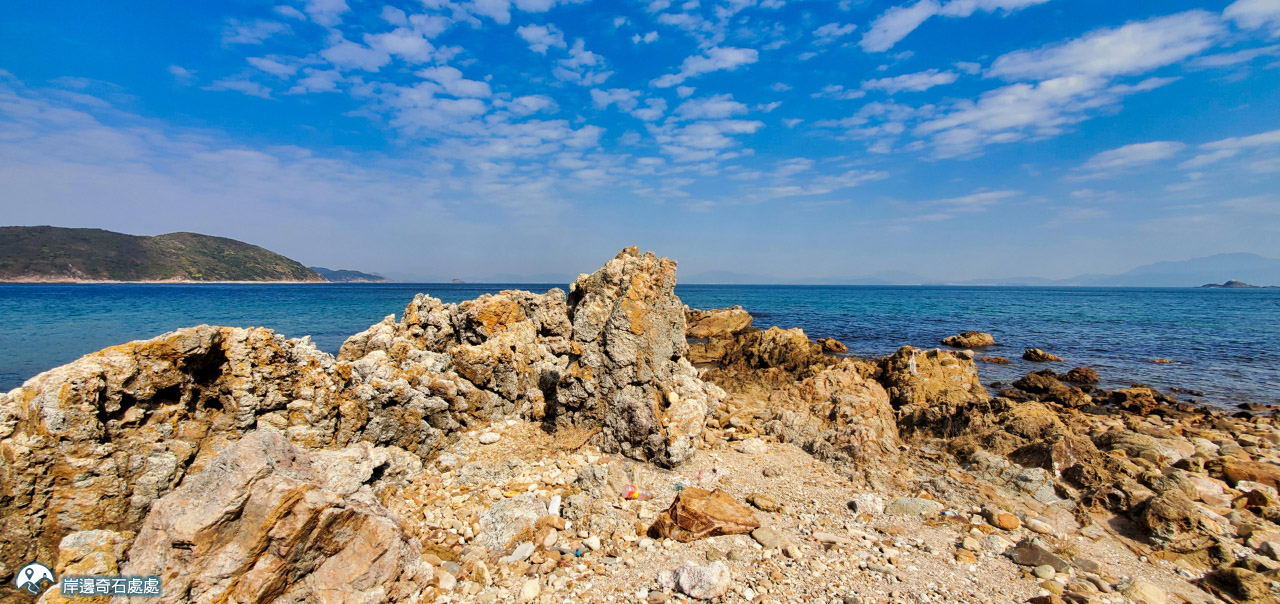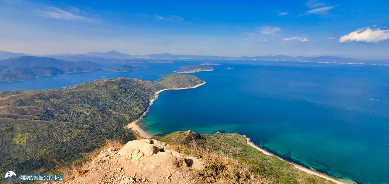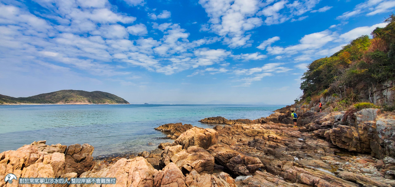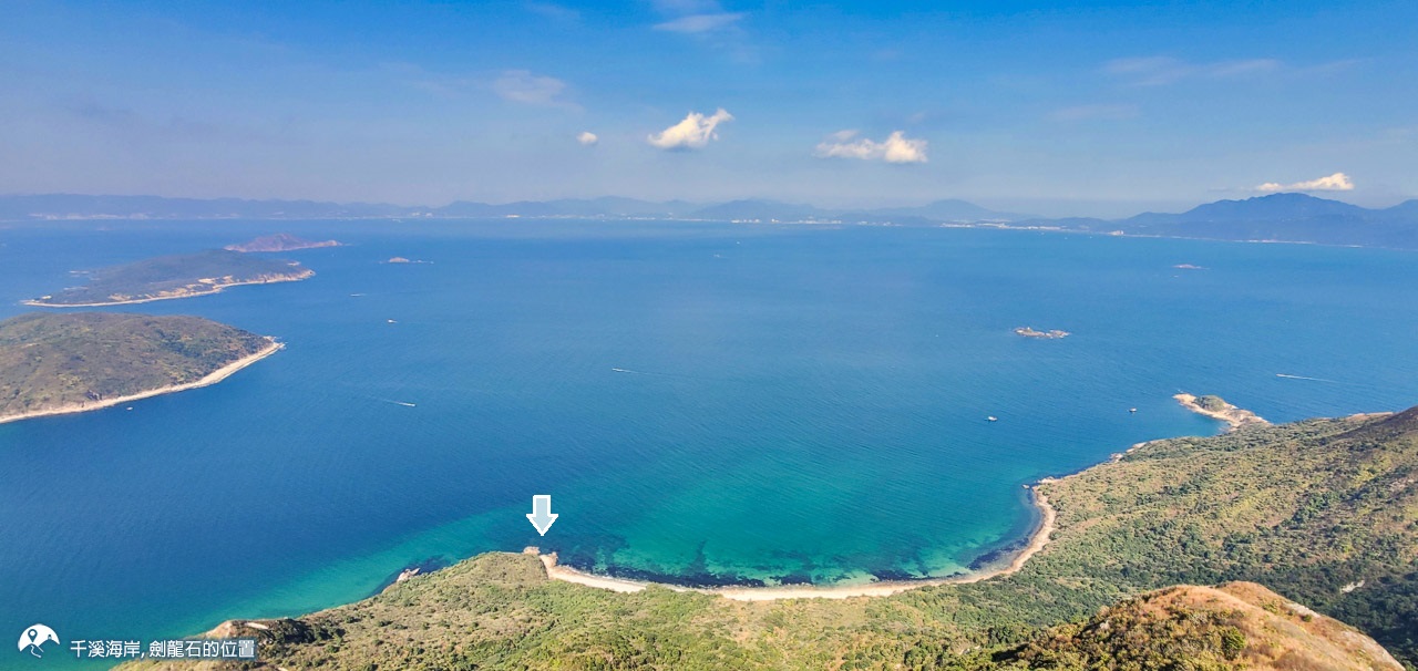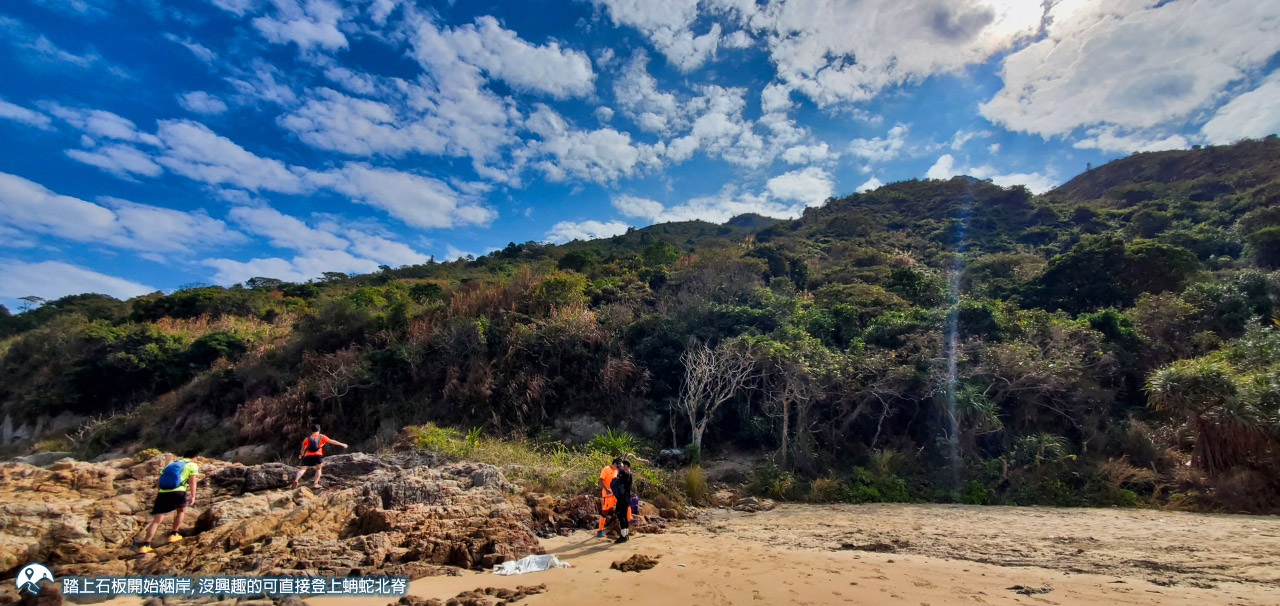 蚺蛇灣地理位置偏僻,人流相對較少,沙灘的人為污染亦較輕微。抬頭望向旁邊的蚺蛇尖氣勢不凡。蚺蛇北脊的入口在沙灘的另一頂盡頭處,位置明顯不難找,而劍龍石則需從旁邊的岩石綑岸前往,距離約 700 米。整段路比預期中的好走,注意平衡及小心通過濕滑位置便可,沒有特別危險需要「搵命搏」的位置。只是起步後不久會被一個大型岩溝阻擋去路,即使潮退也難以直接通過,需爬上旁邊的山坡繞過再下降。山坡有繩輔助但看似殘舊,別過份依賴,兩邊山坡泥土鬆散,斜度不少。通過此位置後餘下路段不難應付,可自由發揮。越過兩個小岬角後,放眼盡頭處便可看到十分形似的劍龍石,拍照過後可順道欣賞一下周圍形狀各異的岩石及清澈的海岸。劍龍石後方有就頗高的岩壁,若爬過可繼續往千溪海岸前進,但注意前方沒有簡易的退出點。