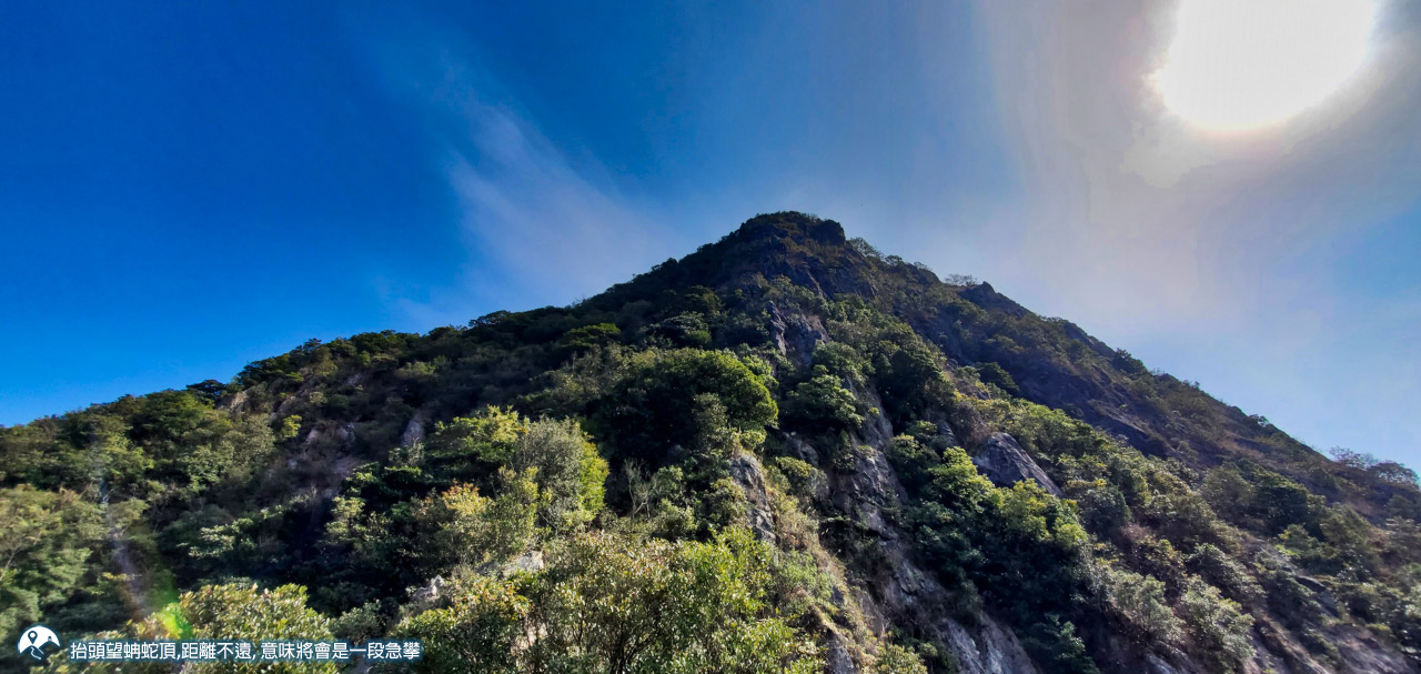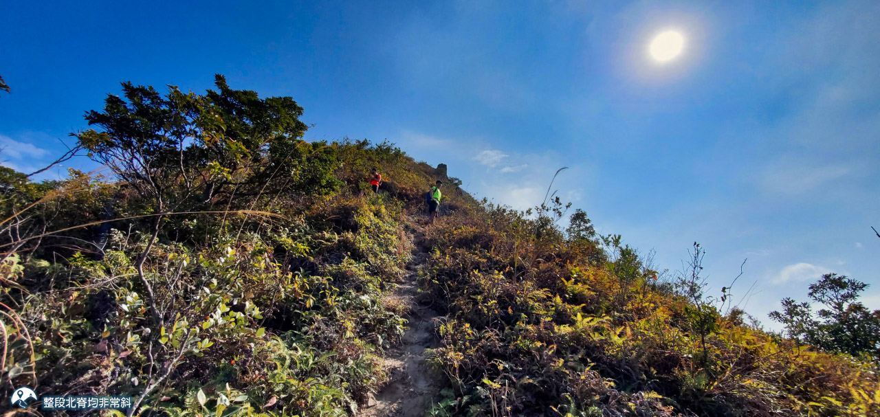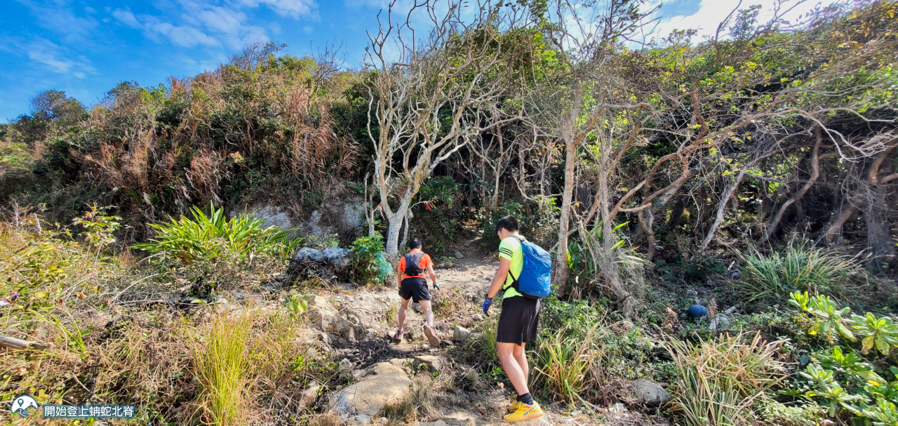 原路折返至蚺蛇灣,稍作小休後出發前往蚺蛇北脊。甫起步已是頗斜的山坡,基本上不是山路而是直接爬上山坡。穿過樹林後雖然斜度有所放緩及可見明顯的路胚,但仍然十分陡峭,而且整段路也維持著這個斜度,路線有狗牙嶺的影子。北脊的長度只有 800 多米 (運動場兩個圈的距離),但爬升幅度超過 400 米,十分考驗腳力與體力。爬升過程中會經過兩個小山丘,兩處均亦是欣賞風景的好位置,千溪海岸、蚺蛇灣、高流灣及稍後會經過的東龍二輋景色均盡收眼底。而經過第二個山丘,爬過少量岩石後入似乎會有左邊的懸崖分支和右邊的樹林分支,但當天似乎錯過了分支的位置,一直只見往樹林的引路絲帶,而其他遊記亦描述樹林段較為易走,因此沒再找路口直接走進樹林。話雖如此,進入樹林後坡度再次急升,不少位置每步高低差接近一米,幸好沿路不乏粗壯的樹幹可稍為借力。一輪搏鬥後聽到喧鬧聲漸響便代表離山頂不遠。爬上最後一段有一條連上銅條的斜坡後便抵達蚺蛇尖。