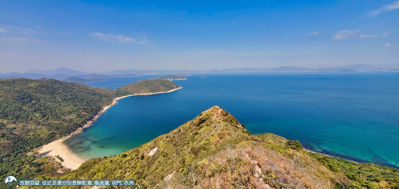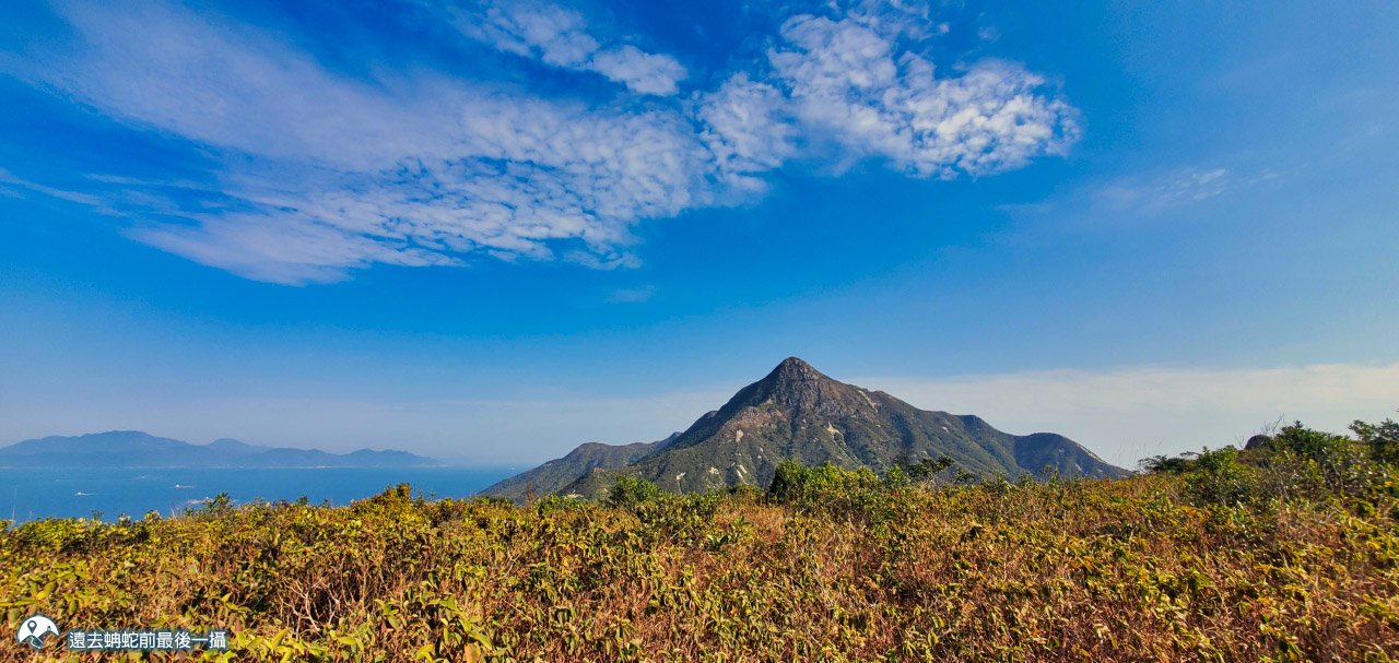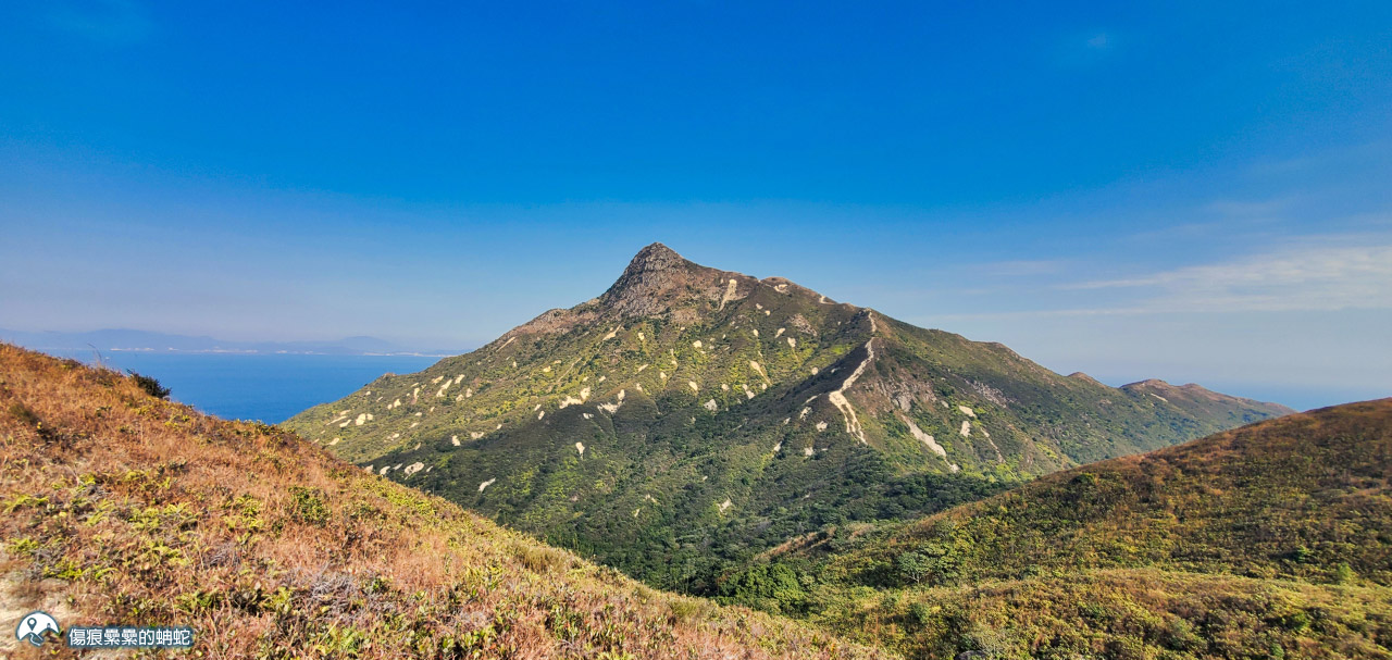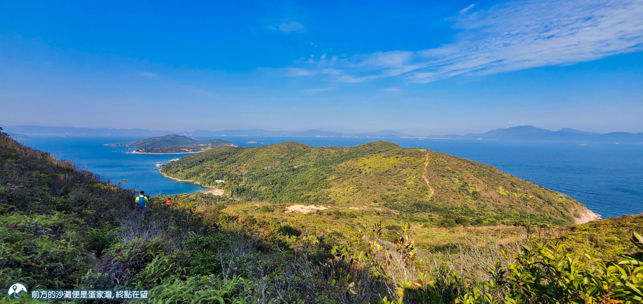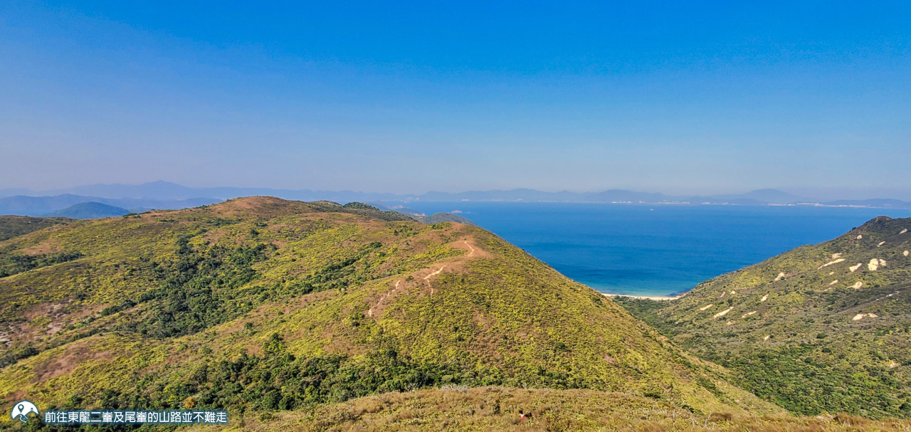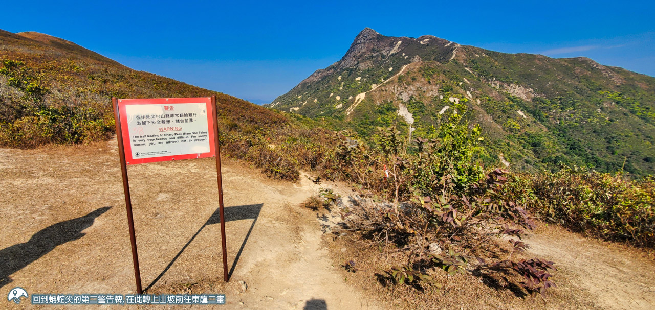 山頂上遊人眾多不欲久留,火速從南脊下山。相隔幾年再走南脊的四段斜坡,說是路胚,但更像「沙灘」。水土流失令路面變得越來越難走。但遊人不減,似乎沒有辦法能挽救。下一目的地是東龍二輋山嶺,本路線走到蚺蛇坳與大浪坳之間的警告牌再轉往北走,但從蚺蛇坳走來其實有兩條捷徑(詳見分支圖示)。先是一段數十米的爬升,然後會下降至一個多重分叉路口。在路口朝北面走,再來一段急登後便是東龍二輋的山嶺,右邊可一直觀賞到蚺蛇尖的風景。從這個方向走會先經過東龍頭輋、二輋,最後才來到尾輋。至尾輋前的路段起伏不大輕鬆易走,風景亦不錯。經過尾輋後便開始遠離蚺蛇灣並下降,越過一山嶺後已能看到右下方的蛋家灣。小心完成最後的下降段,接上水泥路後轉右回到蛋家灣,在蛋家灣公廁的另一邊走出來接回早上走過的路,最後回到高流灣完成行程。
