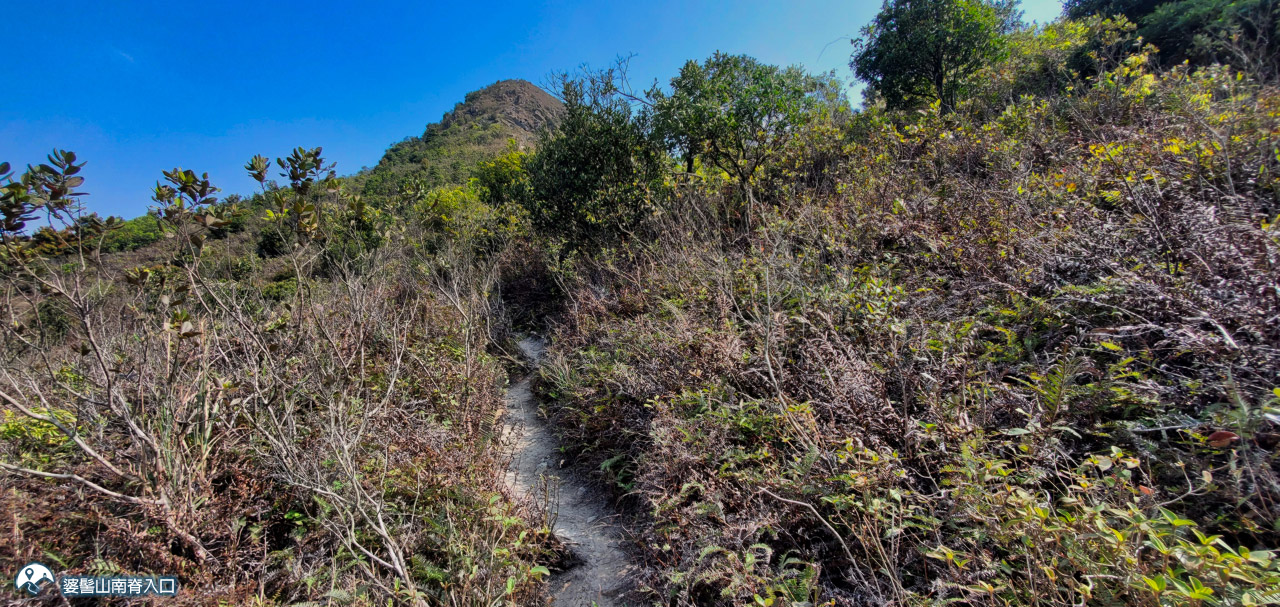 慢慢走的話走約 45 分鐘便能到達婆髻山山坳接上路況較良好的山徑。山坳位置正對著婆髻山西脊,但這次計劃在南脊登山西脊下山,所以先沿平緩山徑走約 300 米至婆髻山南面,留意左邊山坡有絲帶標記南脊的入口,位置正確的話抬頭即可望見南脊的重重巨石。從入口至山頂的距離不足 300 米,路況以岩石為主。接近山頂的位置需手足並用越過體積較大的岩石,其中一塊巨石的高低差較大,身型較小的或需借力一躍而上,需注意平衡小心前進。一輪攀爬後終於登上海拔 482 米的婆髻山。山頂沒標高柱,景觀尚可,能望到不遠處的薄刀屻和蓮花山,往北則能看到機場及人工島。