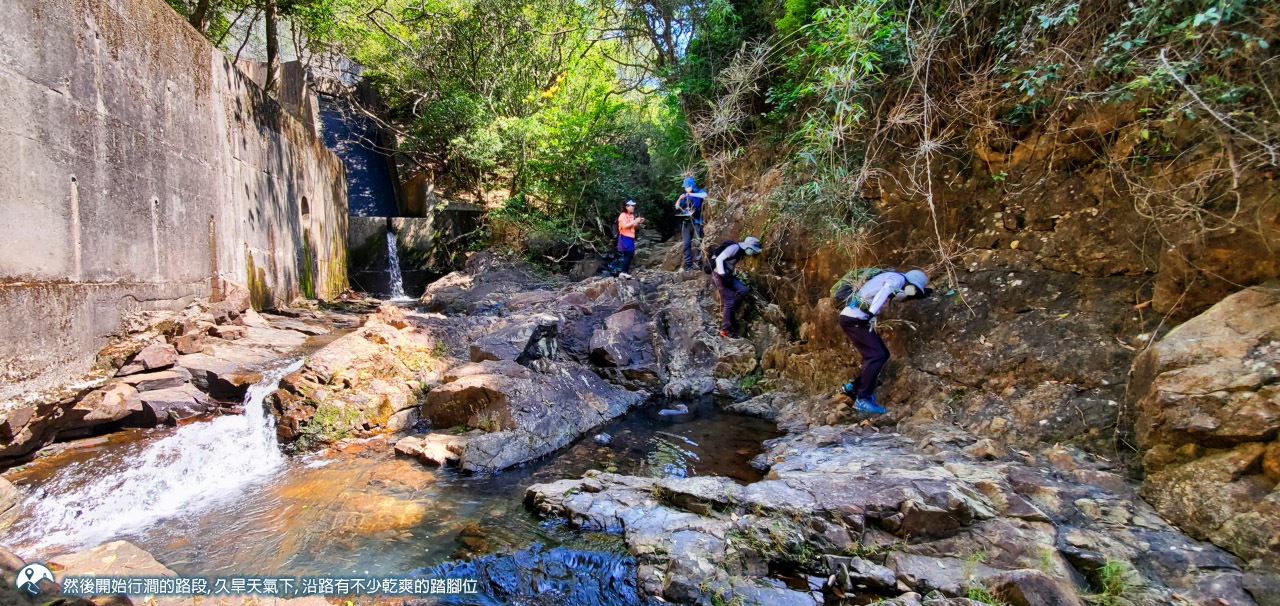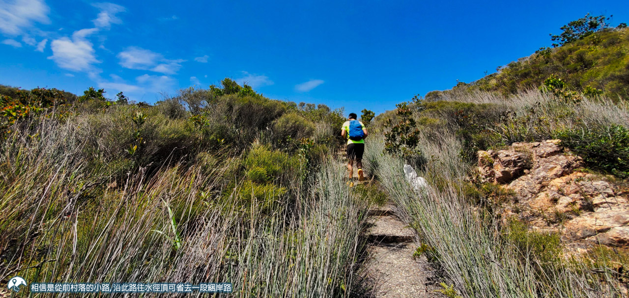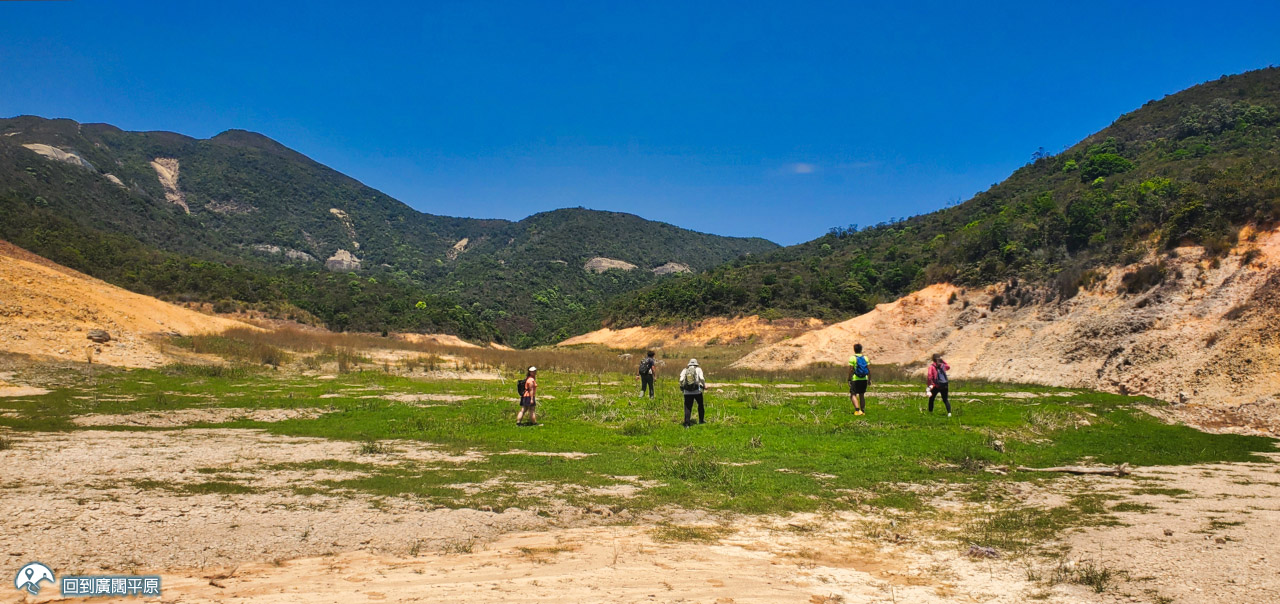 由西灣亭出發至水徑頂,有別於大部分西貢郊遊路線往西灣村走,起步時沿西灣路往下走至盡頭處的水務設施,隨後繞到對面的山坡沿斜坡稍作下降至黃竹坑右源(亦可在抵達水務設施前的彎位旁下降,但位置較不明顯,可參考相片)。斜坡危險度雖然不大但斜度不低,宜小心緩緩下降。接下來沿澗走的路段,由於不涉水前往水徑頂的前提是持續乾旱的天氣,因此雖然是行澗路段,但不用擔心水位高及水流湍急,加上路段高低差不大,來訪時機正確的話不會太難應付。只需一直找乾爽的落腳點前進便可。前進一段時間後來到溪澗盡頭,亦即是萬宜水庫的範圍。水流變得更溫和之餘風景也漸漸開揚。這片平時被水淹蓋的土地,水褪後的景色相當特別。水位持續下降令綠色植披下的黃土曝露於空氣中,置身其中有如在地底窺探地面。接壤萬宜水庫的區域地勢較高,長久最露於空氣中的河床長出不少嫩草,驟眼望去就像一個大草原。續往水徑頂前進,沿途不難發現一些建築地基和破損的陶瓷,這是因為萬宜水庫所地是數條歷史悠久的村落,當上世紀 70 年代落實興建萬宜水庫後,村落逃不過長眠於水底的命運。適逄水位下降而能找到一些往日的痕跡。續往水塘邊緣方向前行,不難發現右方有一條相對較完整小徑,走這條路可以省去一段綑岸的路程。走到小徑盡頭已能看到水徑頂就在不遠處,接下來必須綑岸而過。這段路盡是碎石和泥沙,沒有能借力輔助的位置,前進時需格外小心注意平衡。也盡量避免越走越高令末段需大幅度下降。最後來到接壤水徑頂的位置,水位下降令人可以不沾水地步行至對岸,估計雨水充足時,水位至少也會到小腿位置。登上水徑頂後可續走至 158 米高的山頂,這次行程則沒有再前進,在對岸逗留一會後便原路折返,留多一點時間欣賞前段廣闊平原的獨特風景。回程的難度與去程相若,在接近回到起點時可靠溪澗左面走(面向起點),留意左面山坡有人曾架設簡陋的繩索回到西灣路。