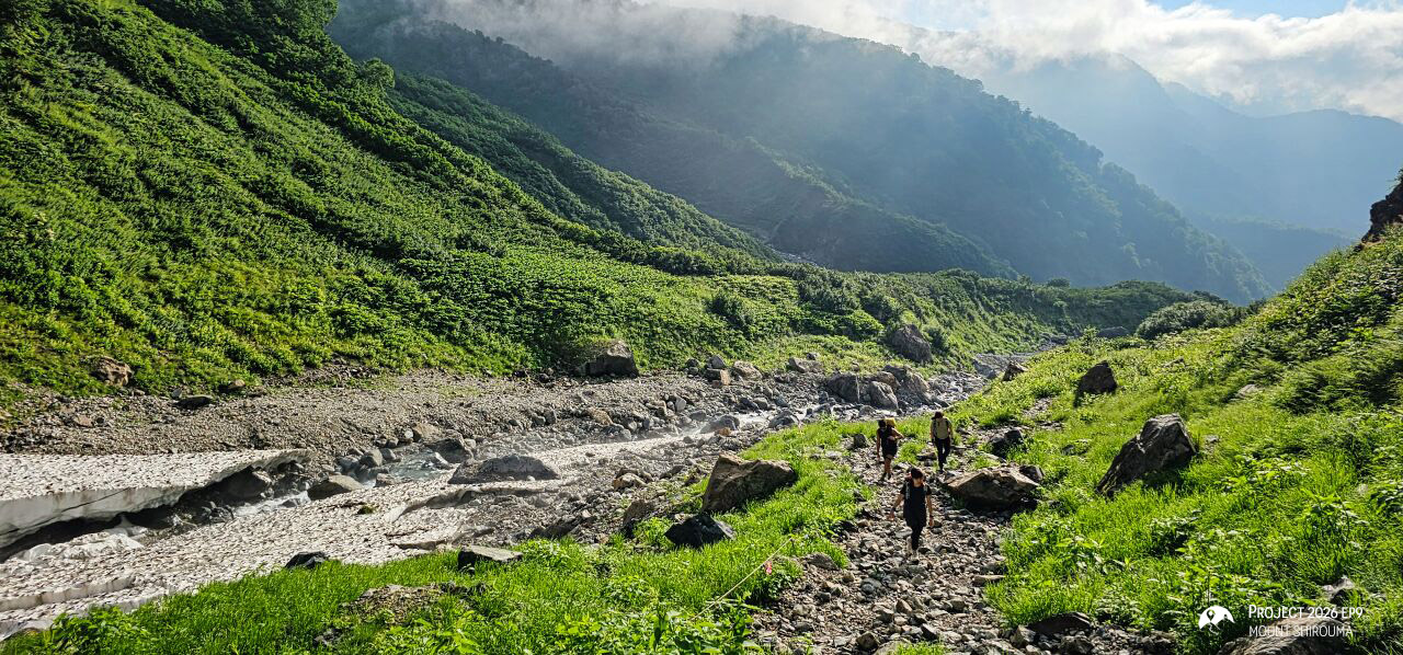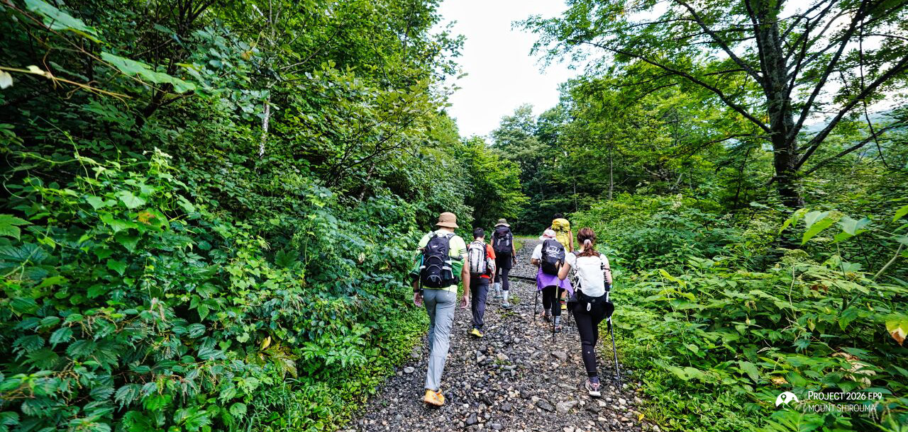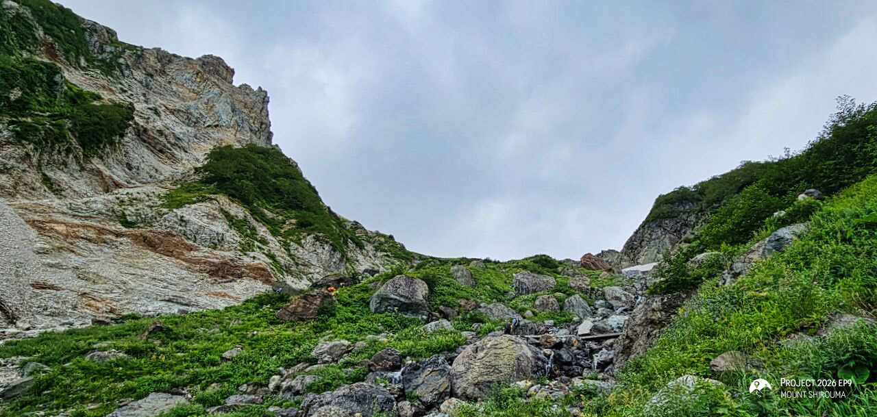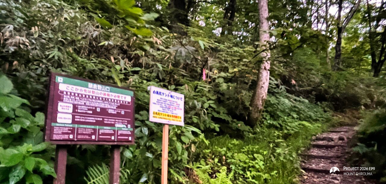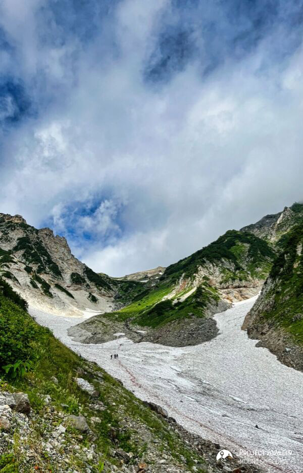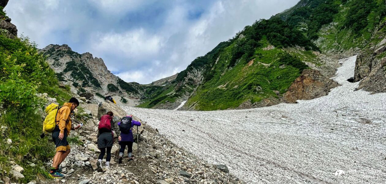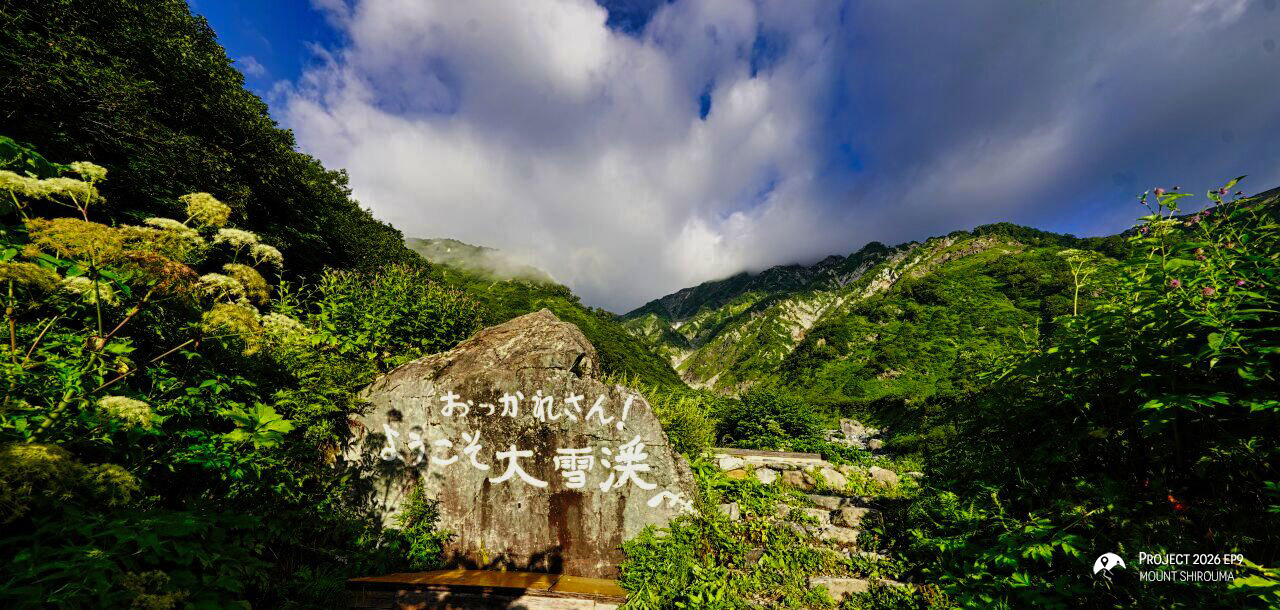 猿倉荘旁邊便是猿倉登山口,猿倉荘有四爪冰爪租借用,在白馬山荘歸還會退回部分按金。遞交預先填好的登山計劃書後便正式出發。在抵達大雪溪前是輕鬆的熱身路段。途中會經過鑓温泉小屋的登山口,路線較長且不經大雪溪,但能經白馬鑓ヶ岳及杓子岳至白馬岳,不用走回頭路完成白馬三山,設於該路線的白馬鑓温泉小屋亦是少有附設露天風呂的山屋。隨著高度爬升,寬闊的山路漸漸收窄成木道,路面漸見較大的石塊,斜度亦有所提升。約一小時多後看見一俾塊被噴上「おつかれさん!ようこそ大雪渓(Good Job!歡迎來到大雪渓)」的巨岩,根據地圖,這裡應該是海拔 1,560 米的白馬尻小屋所在,惟到達時放眼四周除了一個洗手間外並沒有其他建築。及後翻查資料才發現白馬尻小屋自 2021 年起暫停營業,山屋設施亦已拆除,因此才看不到「山屋」。