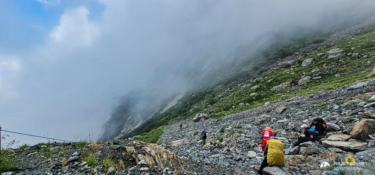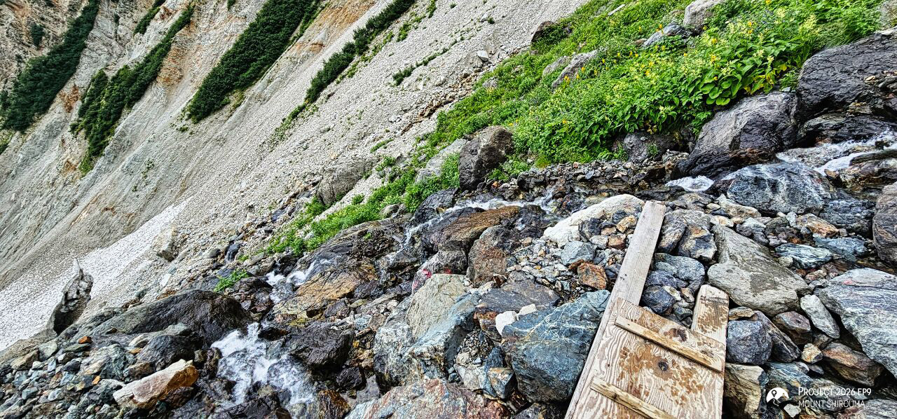 白馬尻小屋所在地的旁邊已是白馬大雪溪,隨後的路段與雪溪平行而走,初時仍有架設好木道的路段,及後基本上全是崎嶇不平的岩石地形,周圍的植披亦會漸漸減少。當無法繼續沿石路前進時便代表需進入雪溪繼續爬升。穿上冰爪進入雪溪,時值八月中旬,踏上雪溪的腳感雖不是新雪但亦不是硬冰,不用花力氣提腳也不用擔心抓不穩,感覺反而比剛剛的岩石段更易應付。此時天公造美放晴,一行人在雪溪上拍下了不少美麗的風景。雖然抬頭是一片藍天,但回望山谷不斷有雲湧至,想起中午過後那接近 100% 的降雨率,也不能在中途逗留太久。走了一小段後來到一岩石堆處,看到有登山者已把冰爪除下,再看看前方的路已是沿雪溪的另一側而行,不用再踏上雪溪,冰爪段比當初得來的資料短很多呢!原來八月中旬雪溪的積雪範圍已大幅減少,不少原本要經雪溪而上的路段此時已可走岩石路,因此雪溪的體驗突然便完結了,雖然走岩石路確實較安全,但還想再踩多一會雪呢~隨後的路況與進雪溪前的一段相若,只是變得更陡峭及更崎嶇。根據地圖等高線,海拔 2,250 米之後的爬升變得較急,而這段的風景也沒有什麼變化,所以可以很專心的(靠意志力)登山。爬過重重岩石,不知經過了多少時間後終於來到避難小屋,總算到了一個 check point。積雪充足的話,雪溪段會一直伸延至避難小屋前才完結,且末段非常陡峭,難度比現時更上一層樓。稍作休息後繼續爬升,官方資料由避難小屋至白馬山莊還需兩個多小時,上升過程中唯一能鼓勵自己的,就是距離只會慢慢減少,只要不停下來終能夠抵達。來到海拔再高一點的位置,路旁間中能看到不同的花卉,據說大雪溪上方的蔥平能找到高達 800 種不同的高山植物。帶著疲憊的身軀,走了好一段時間後來到 2,553 米的大型告示牌,看到這個告示牌便代表距離踏上白馬岳的山嶺只餘下一段長長的梯級,撐過這段便可以在白馬頂上宿舍稍作休息。踏進白馬頂上宿舍放下背囊的一刻完全有如釋重負的感覺。稍作整理後再次出發走完白馬山莊前的最後一段上升。此時已位處山嶺,雖是上坡段但相比之下易變得十分好走。約 15 – 20 分鐘後便能抵達第一天的宿泊點白馬山荘。