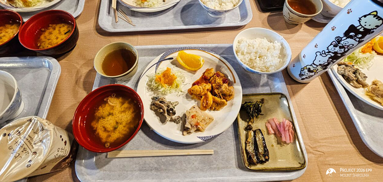 下午五時開始晚飯時間,飯菜和日本其他山屋的差不多,每節用餐時間為 45 分鐘,旺季時大概是潮水式進飯堂用膳,時間差不多的時候會有職員提醒,然而大部分本地的登山者不到 10 分鐘便把晚餐吃光,大概都是把握時間休息。晚飯後和一個來到山莊打工的留日港人聊天,得知因為7 號颱風(蘭恩)前天才橫越關西地區,不少人因天氣不穩定而取消預訂,今天山屋只有 99 人留宿,因此整個山屋感覺格外的寧靜。