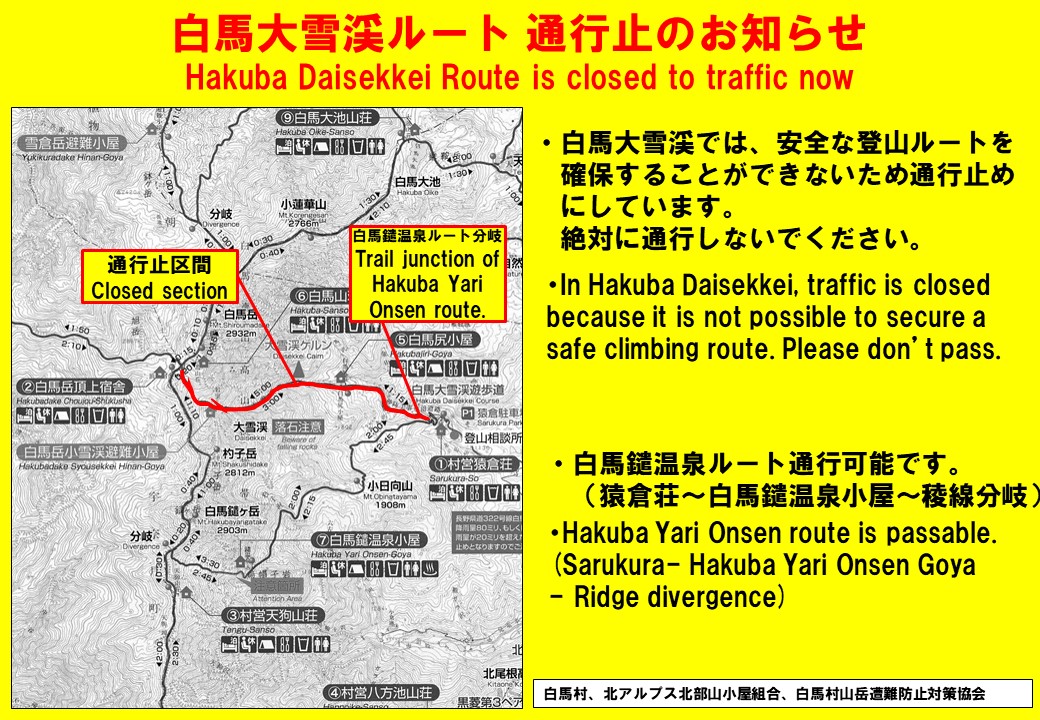 北阿爾卑斯山山間小屋協會和白馬村山地事故預防協會在 8 月 27 日宣佈,由於大雪溪殘雪量小,加上今年夏天酷熱多雨,在視察路況後認為登山路線存在安全風險,因此即日封閉道路。