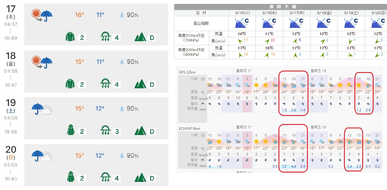 - 山上天氣資訊繼續推薦日本氣象網站 tenki.jp 及其推出的「登山天気」app預報。登山口及山頂的預測跟實際情況吻合。(Android版連結(apk) / iOS版本連結)。程式有一個月試用期。