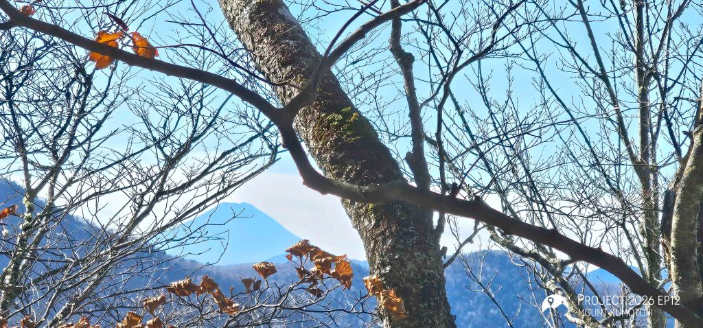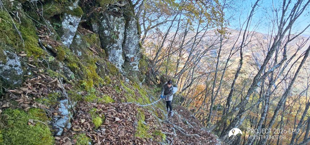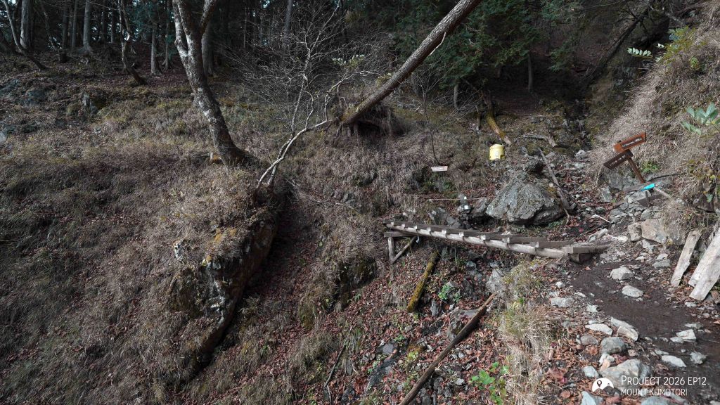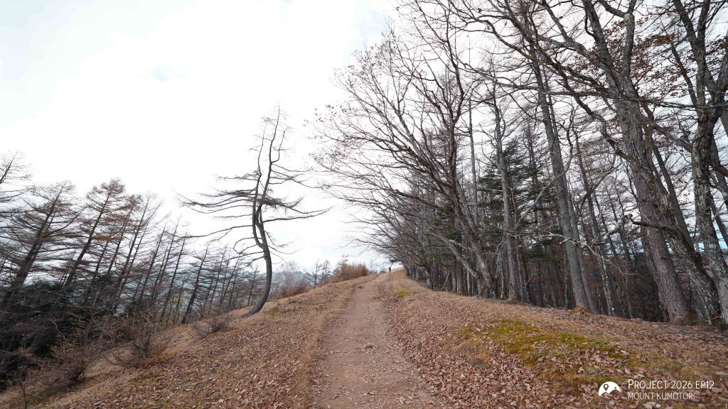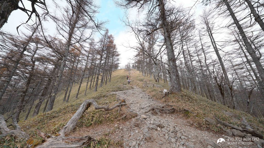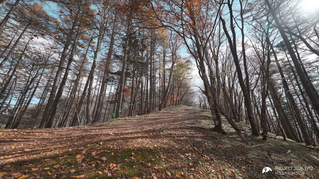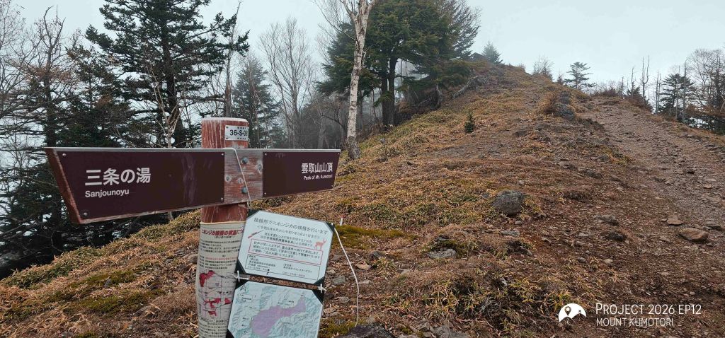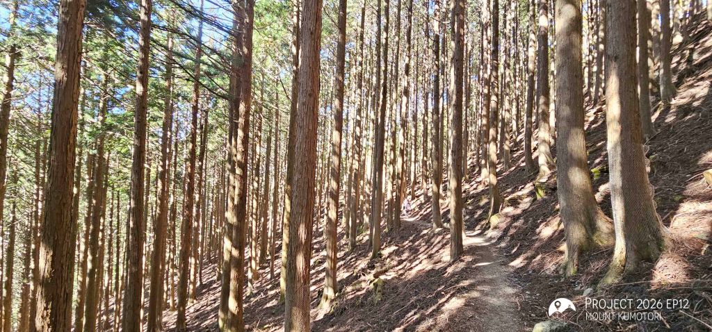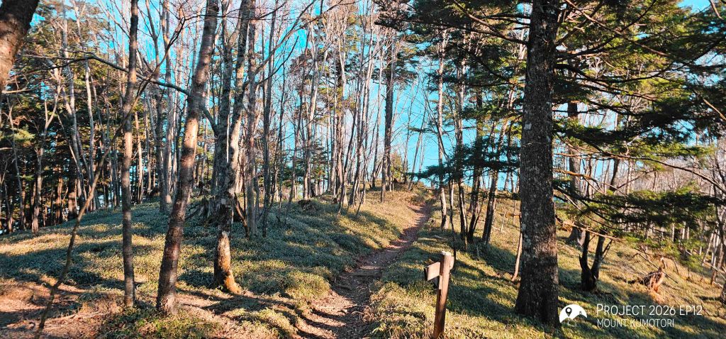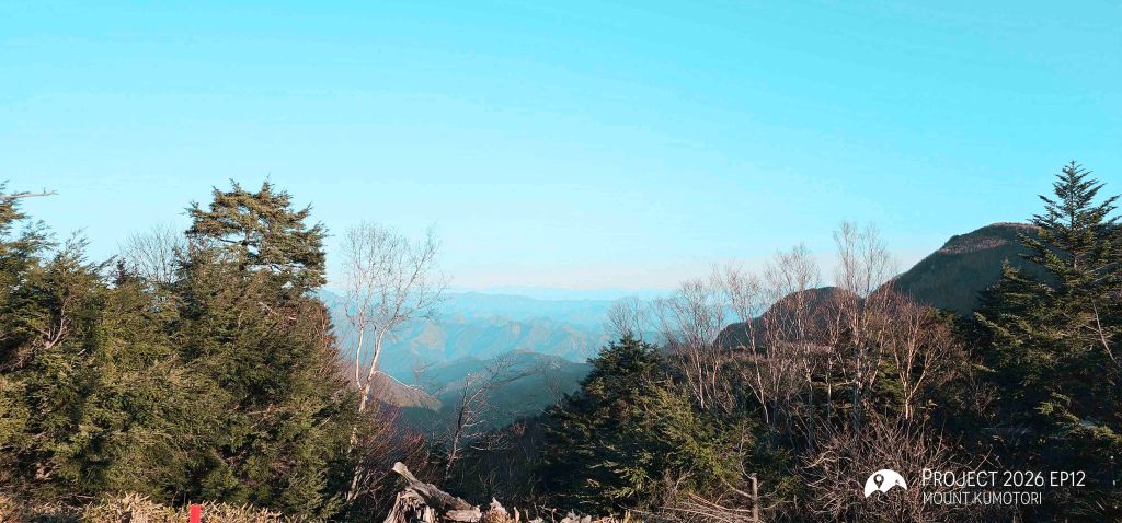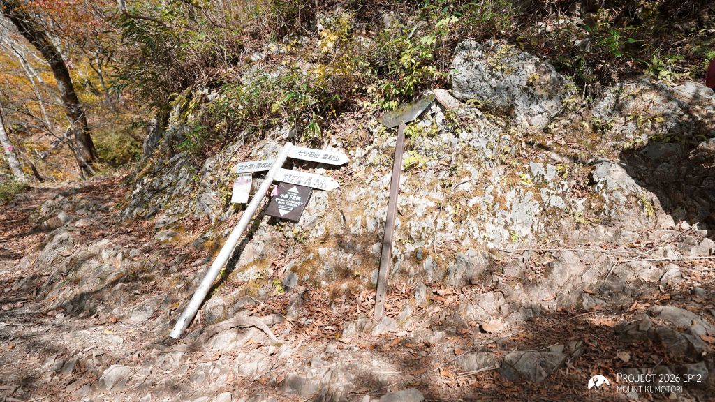 隨著海拔爬升,遠離杉樹林後陽光照進山路,頓時變得暖和。行程約一半處為七ツ石小屋,雖然已過宿泊營業期,但仍有販售杯麵及飲料等補給品,可在此作小休。離開七ツ石小屋後不久會抵達一分岔口,右路可登七ツ石山,左路則繞山腰而過,路程相對較長但省了爬升及下降,兩條路會在前方匯合。匯合之後的路段變得更為開揚。途中會經過一棵型態奇特的孤樹,亦是景點之一。經過直升機坪離開植披保護區後離雲取山頂還有三段主要的爬升,第一段在經過修葺中的奧多摩小屋後,可取道右邊的山腰小徑省卻爬升;第二段爬升完成後留意左方有小路通往小雲取山頂,不留意的話很容易錯過;最後一段較長的爬升則會登上海拔 2,000米的雲取山避難小屋。屋內十分寬闊和整潔,環境甚至比部分山屋好,稍作休息後便前往登頂,山頂離小屋不到 100米,十分「友善」。山頂在能見度高時能看到富士山,可惜這次抵達時遇上了雲霧,什麼也看不到。離開山頂後開始下降前往雲取山荘。路徑大部分是梯級與泥路,整體上不難應付。熬過這一段便可以休息了。